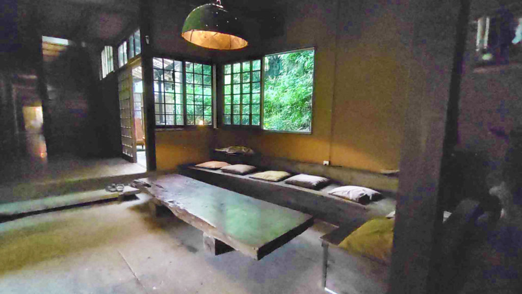 玄関の横もラウンジ的な共有スペースになっていてテーブルと椅子や靴を脱いでくつろげる小上がりもありました。窓の外は川が見えます。
