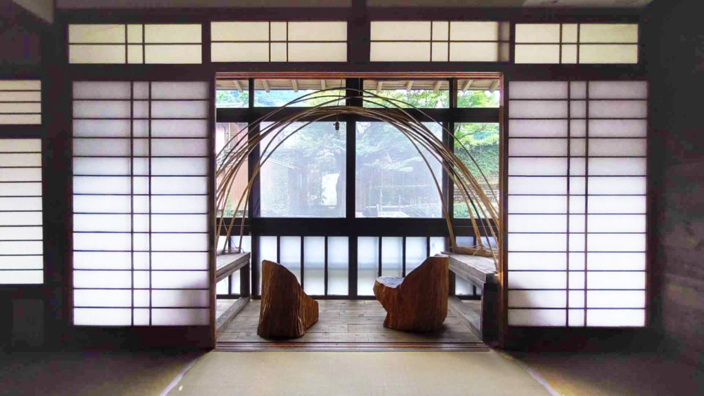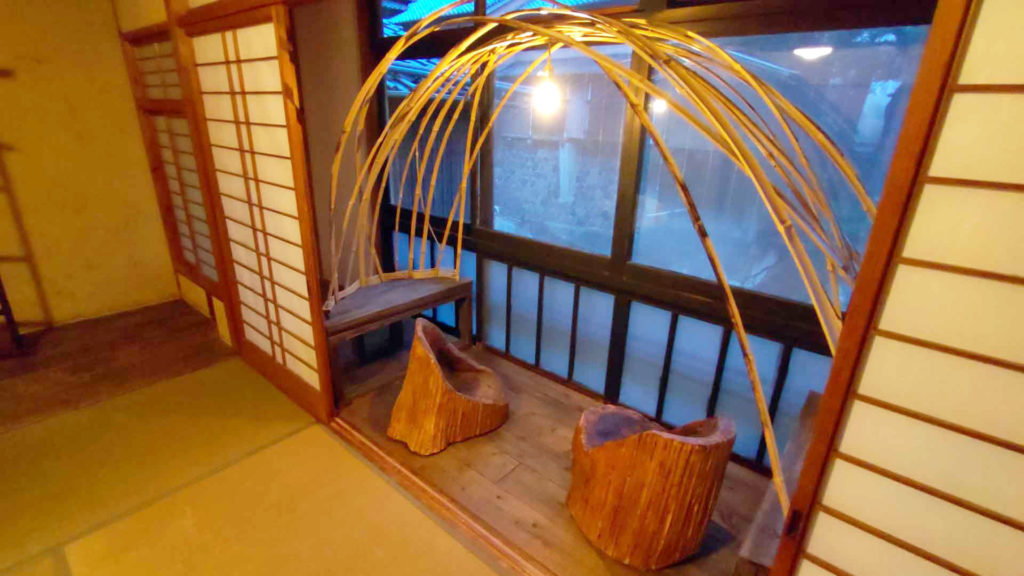 広縁には木の幹をくり抜いたような椅子と木で作られたオブジェのようなものが設置されていました。