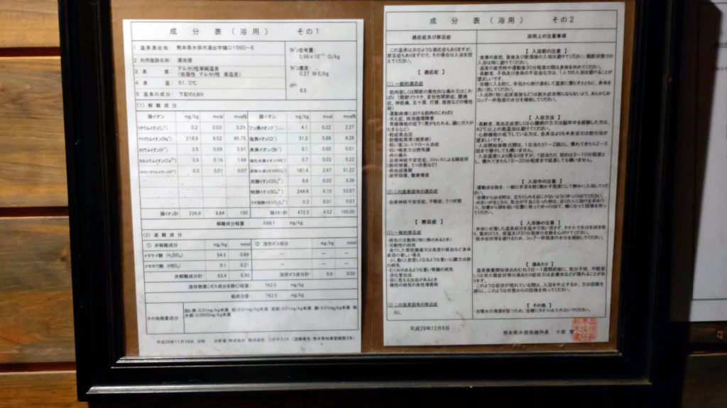泉質はアルカリ性単純温泉(低張性 アルカリ性 高温泉)。源泉の温度は51.0度でpH8.6のアルカリ性の温泉です。お湯は源泉かけ流しで使用されていて加温や加水、循環や消毒剤の投入も無いようです。