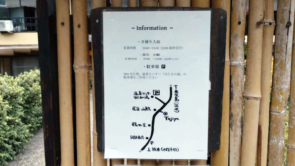 TojiyAの前の道を100メートルとど移動したところを曲がった所に駐車場があります。湯の鶴温泉の道は狭くて車のすれ違いが難しい所も多かったので慎重に運転した方が良いかと思います。(山の間の川沿いの温泉街なのでどうしても道は狭くなってしまうんだと思います)