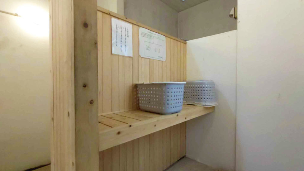 木の棚にカゴが置いてあるシンプルな脱衣所があります。