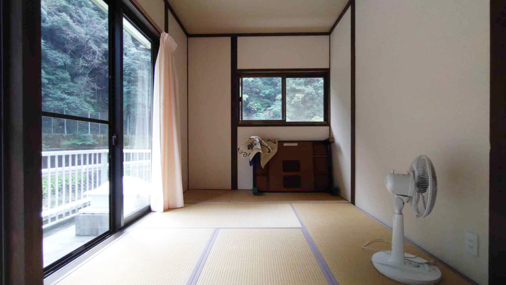 畳が敷かれ奥の窓の先にはベランダがあり川が見えます。