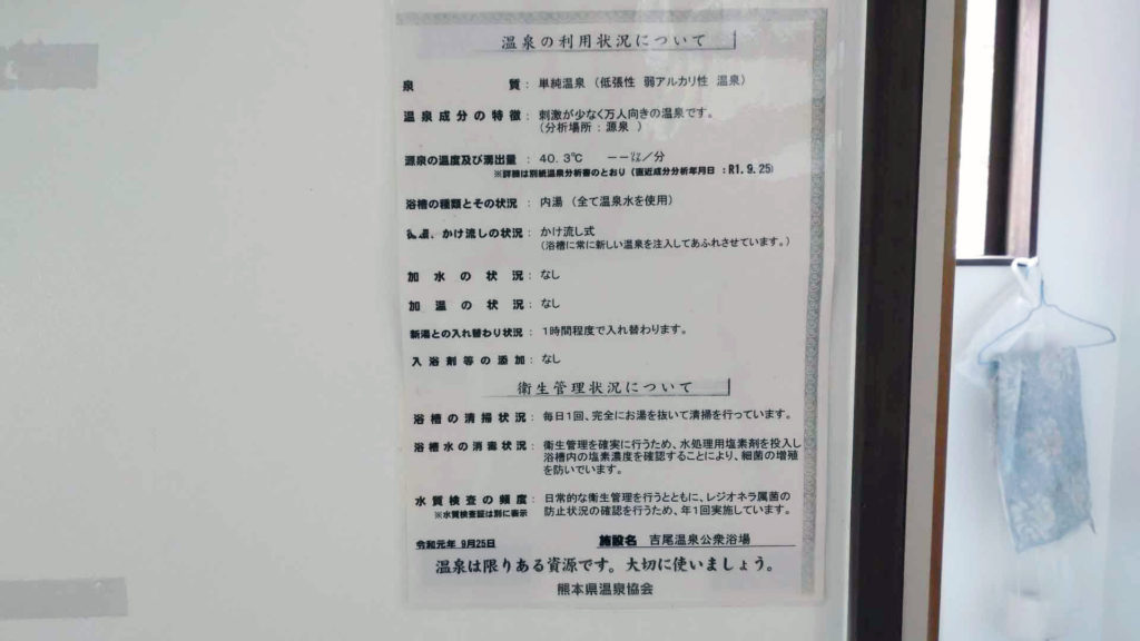 泉質は単純温泉(低張性弱アルカリ性温泉)で源泉の温度は40.3度。循環、加水、加温なしで源泉かけ流しでお湯が使用されていてます1時間程度でお湯が入れ替わると記載がありました。塩素消毒剤を投入と記載がありましたが入浴した感じは特に塩素の臭いは感じませんでした(いつも投入しているわけではないのかなと思いましたが未確認です)。