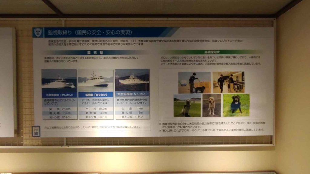 監視コーナーの壁の展示では監視船や麻薬探知犬が紹介されていました。