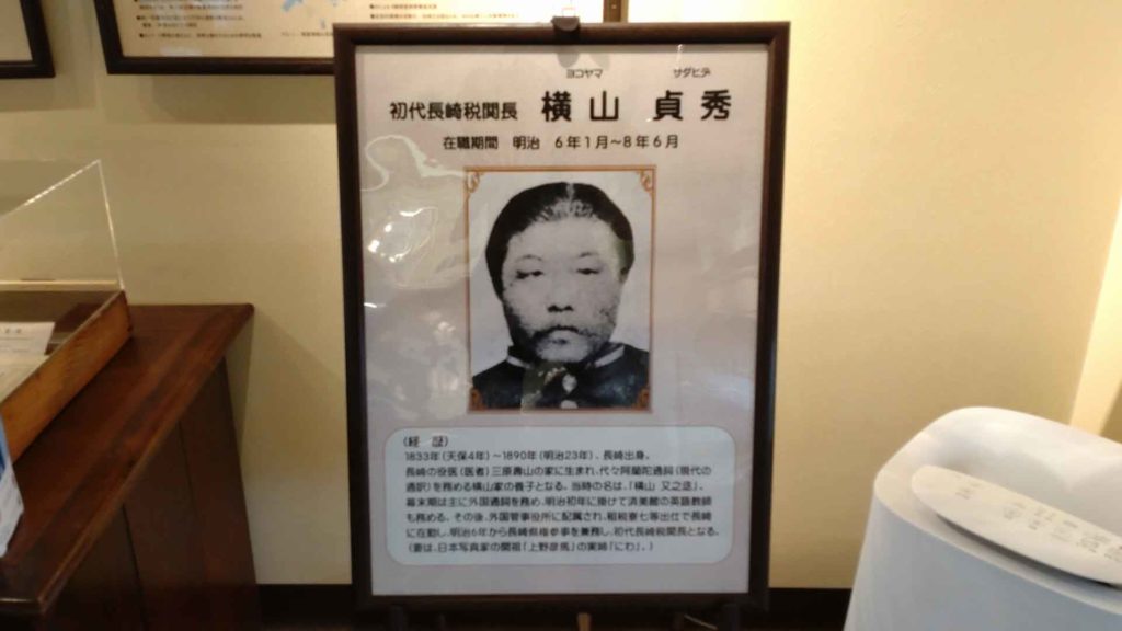初代長崎税関長の横山又之丞貞秀さんも紹介されてました。横山貞秀さんは長崎において長年オランダ通詞(江戸幕府の世襲役人で公式の通訳者)を勤めていた横山家の11代目で幕末までオランダ通詞として活躍。明治維新後の新政府にもその語学の才能を認められて長崎県大属、長崎県小参事、長崎県参事などを歴任後に初代長崎税関長を務めたそうです。