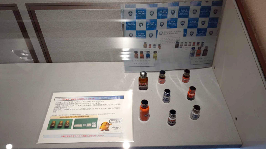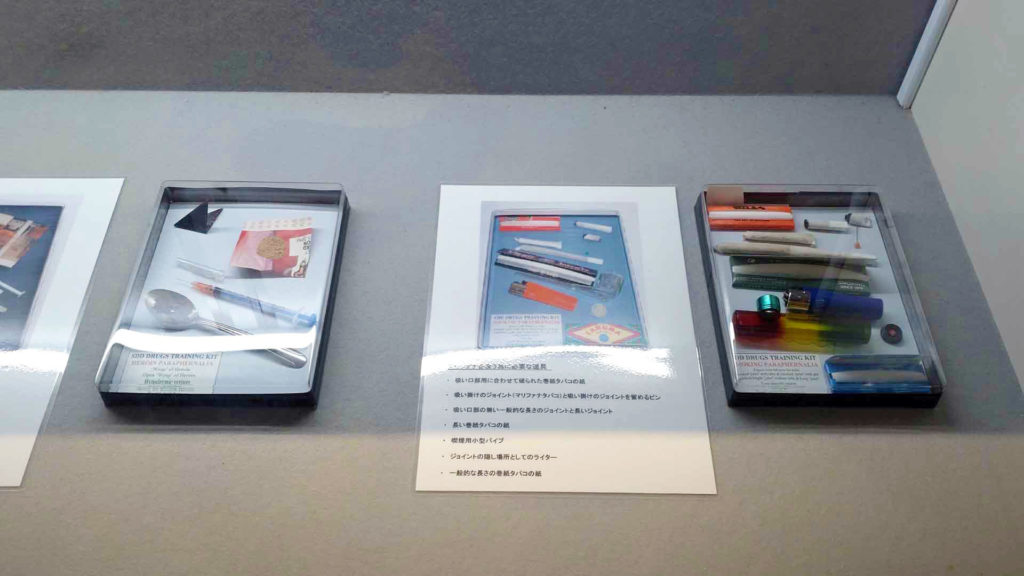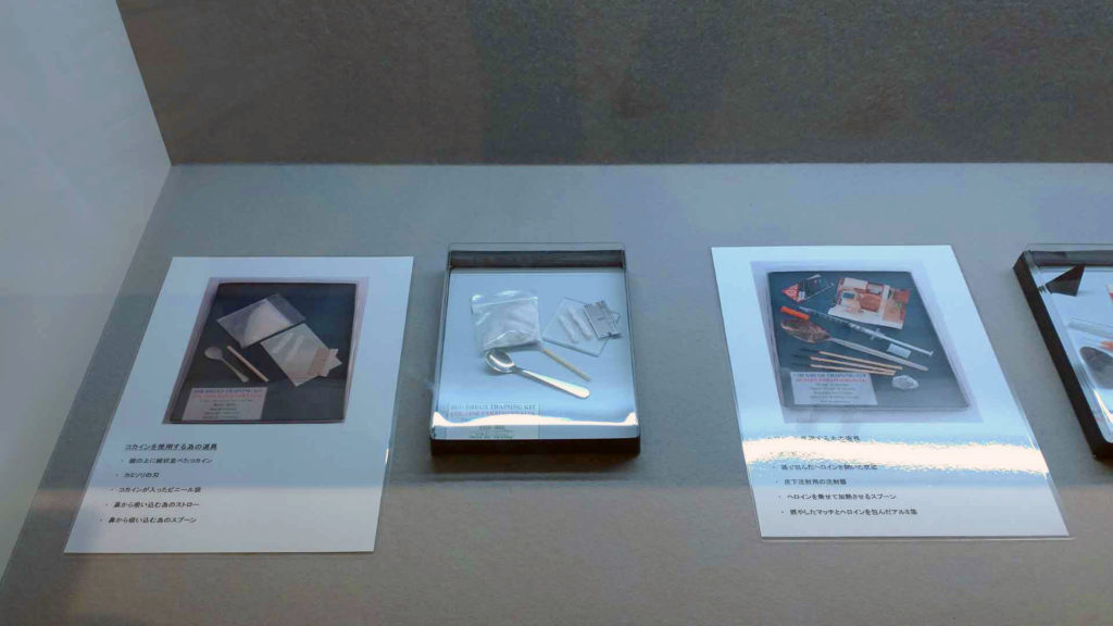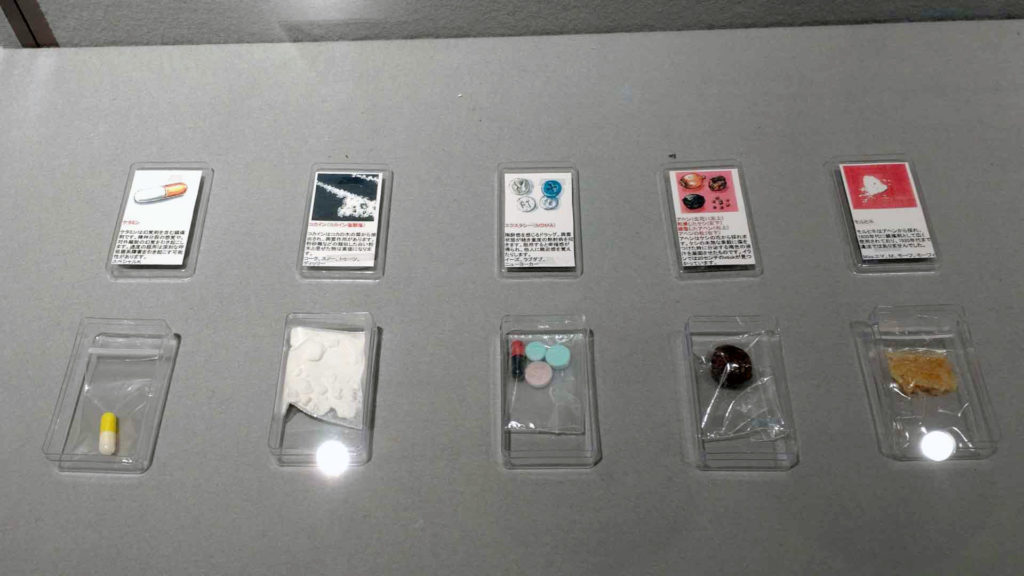 こちらは不正薬物や武器のコーナー。税関コレクションが並びます。白い粉!黒い武器!