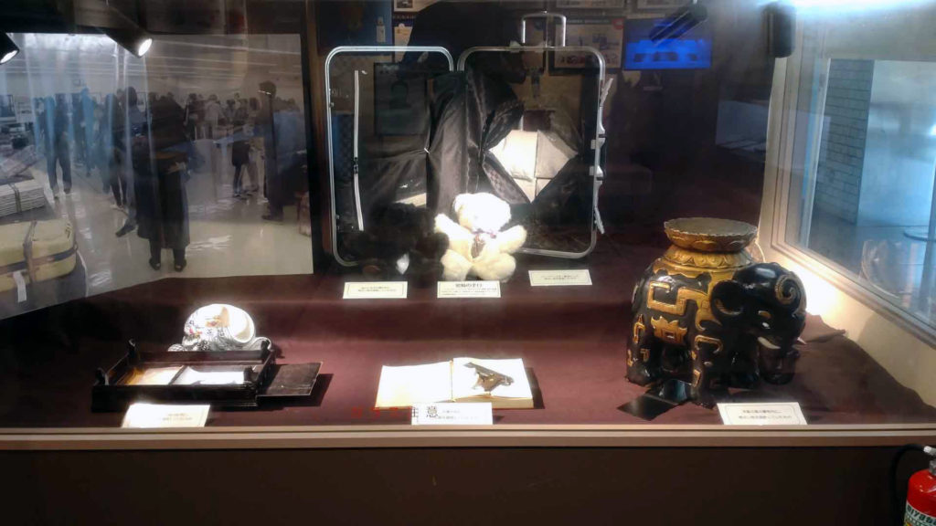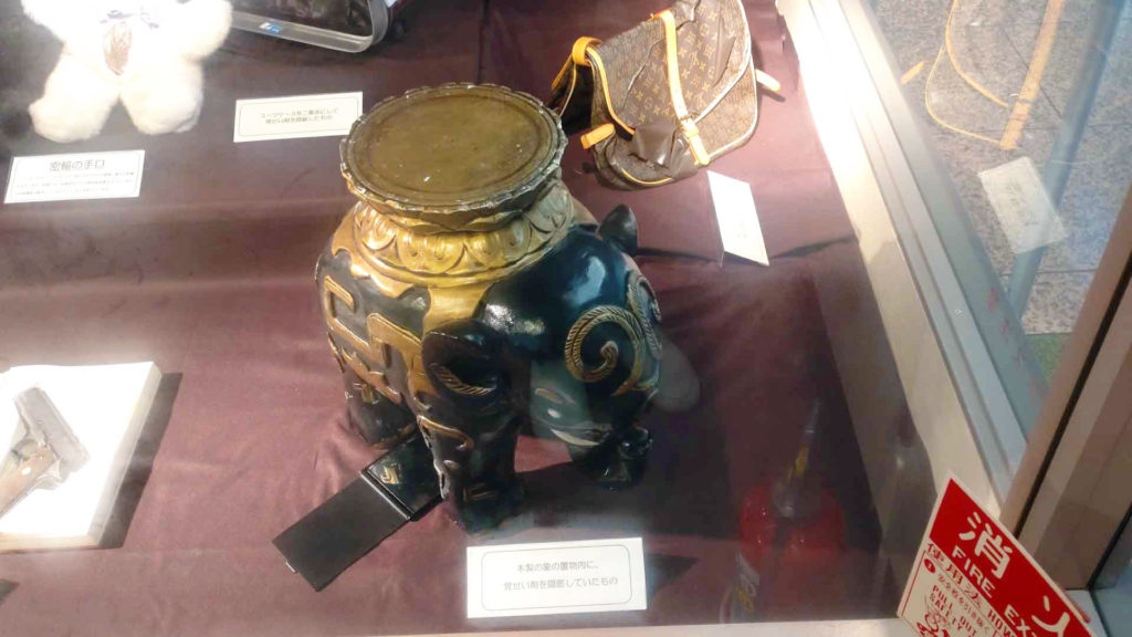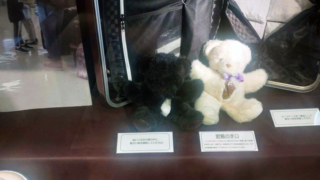 密輸の手口が紹介されています。これはぬいぐるみの腹の中に覚せい剤を隠匿していたもの。お好みに合わせて黒いぬいぐるみと白いぬいぐるみがあります。その後ろにはスーツケースを二重底にして覚醒剤を隠蔽したもの。