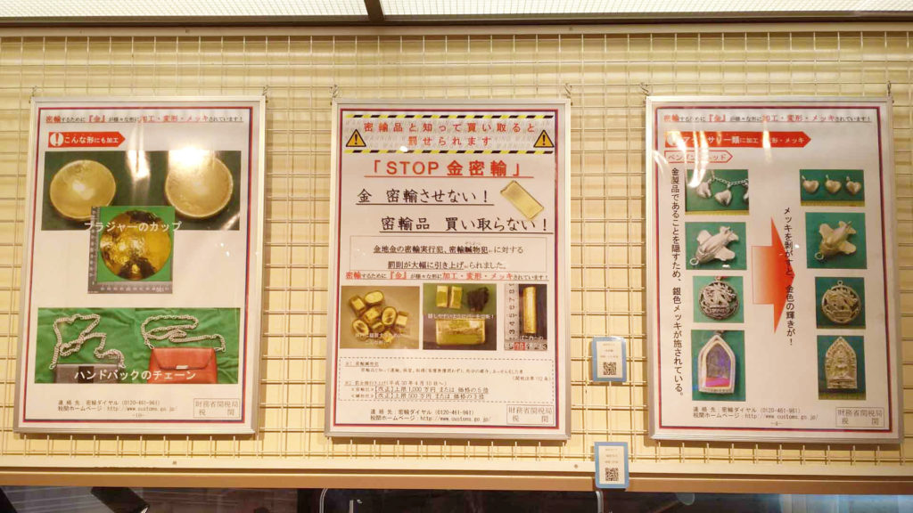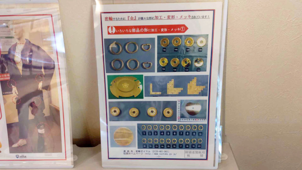STOP金密輸 金 密輸させない!密輸品 買い取らない!という事で金密輸の事例が紹介されています。左上のものは函館税関資料展示室に同じような物(のレプリカ)が展示されていました。