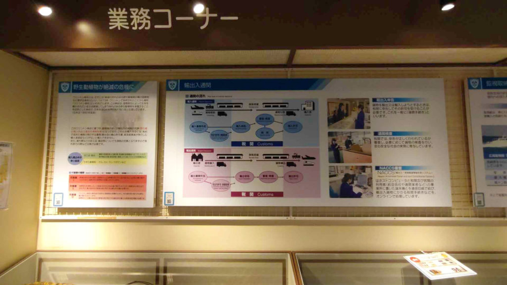 業務コーナー。壁には輸出入の通関業務の流れなどが展示されていました。