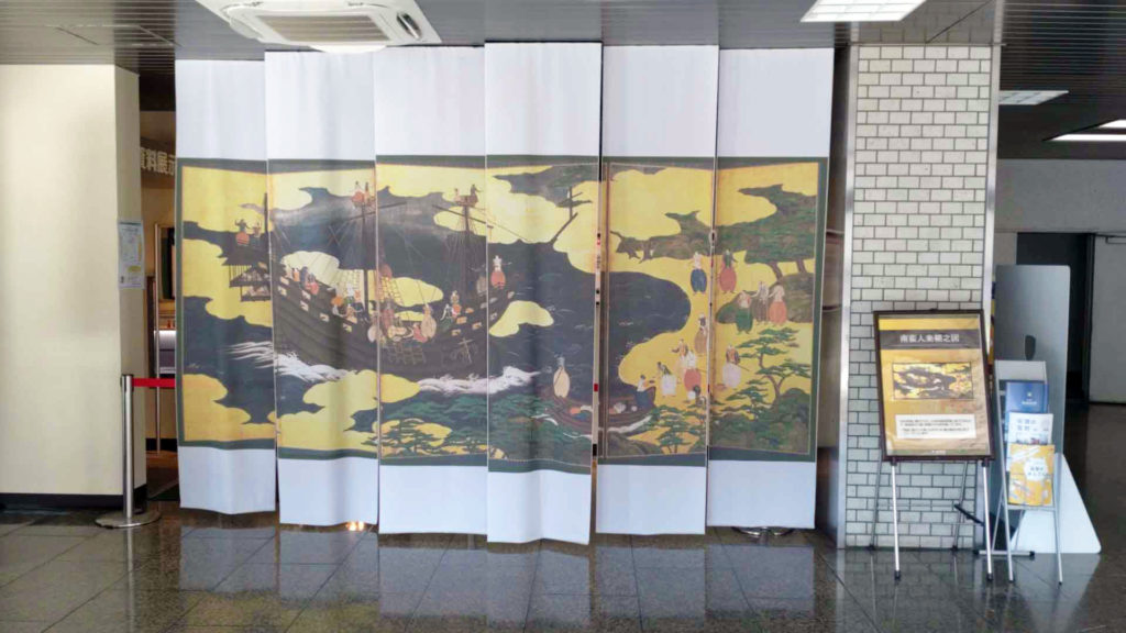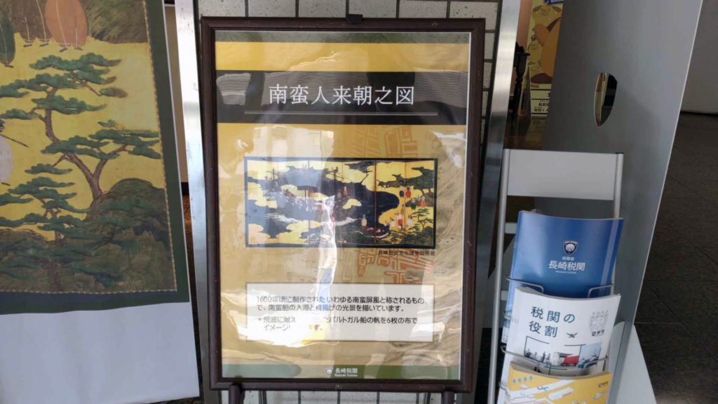中に入ると紙本著色南蛮人来朝図之屏風(のレプリカ)が展示されています。この南蛮人来朝図之屏風の元の物は屏風になっていて南蛮屏風と呼ばれているものの一つのようです。南蛮屏風は1590年代頃から1680年代頃に作られたもので60点ほど現存しているそうです。ここに展示されている物の本物は長崎歴史文化博物館に保管されていて国認定旧重要美術品になっているそうです。
