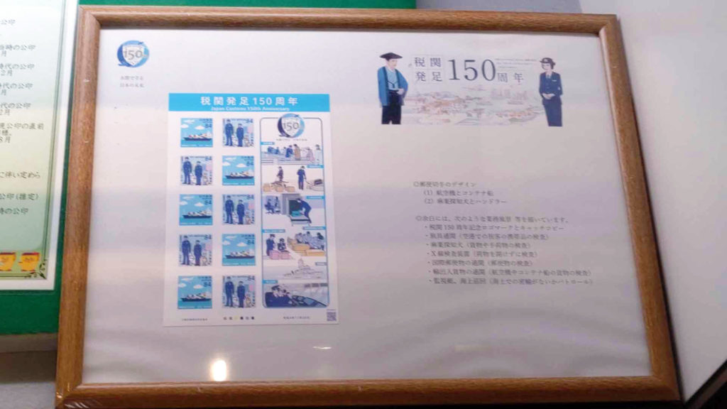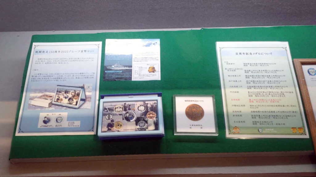 展示ケースの下の段には税関150周年記念プルーフ貨幣セットと税関百周年記念メダルが展示されていました。