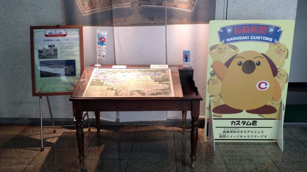 カスタム君の顔はめパネル横には明治から大正時代に使用されていた事務机が設置されていてその上には長崎湾の古地図が敷いてありました。出島の所に矢印がついてます。