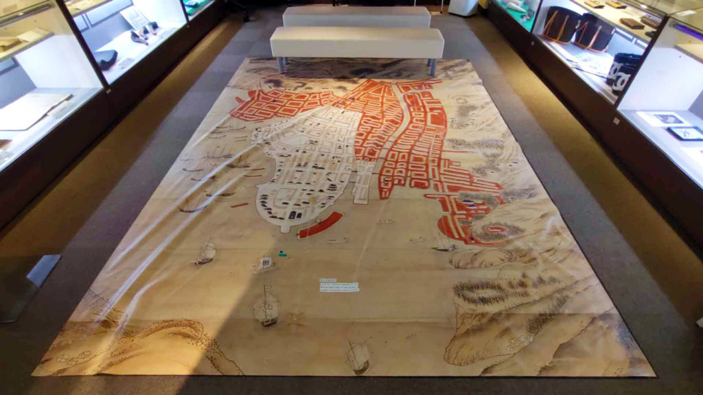 床に敷かれているのは寛永長崎港図を印刷されている布です。寛永長崎港図は寛永時代の長崎が描かれていていますがこの時期に作られた出島の姿も確認できます。