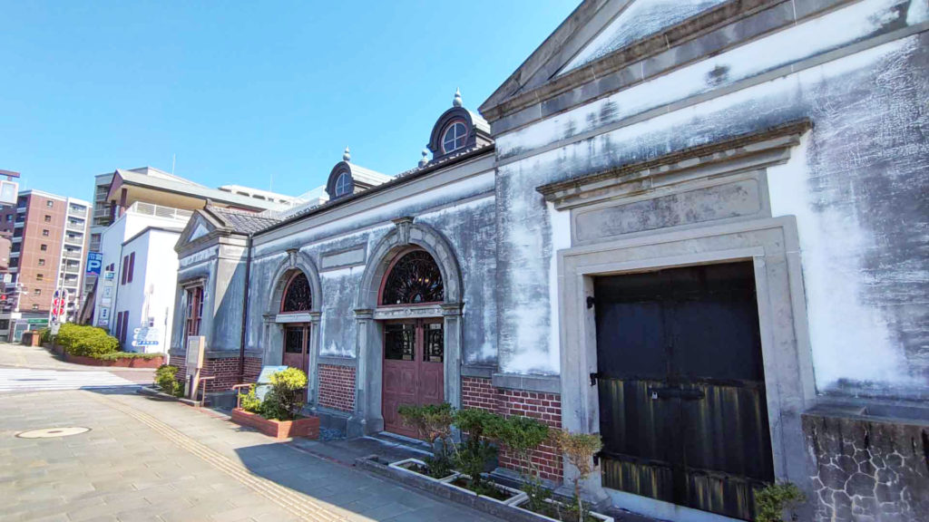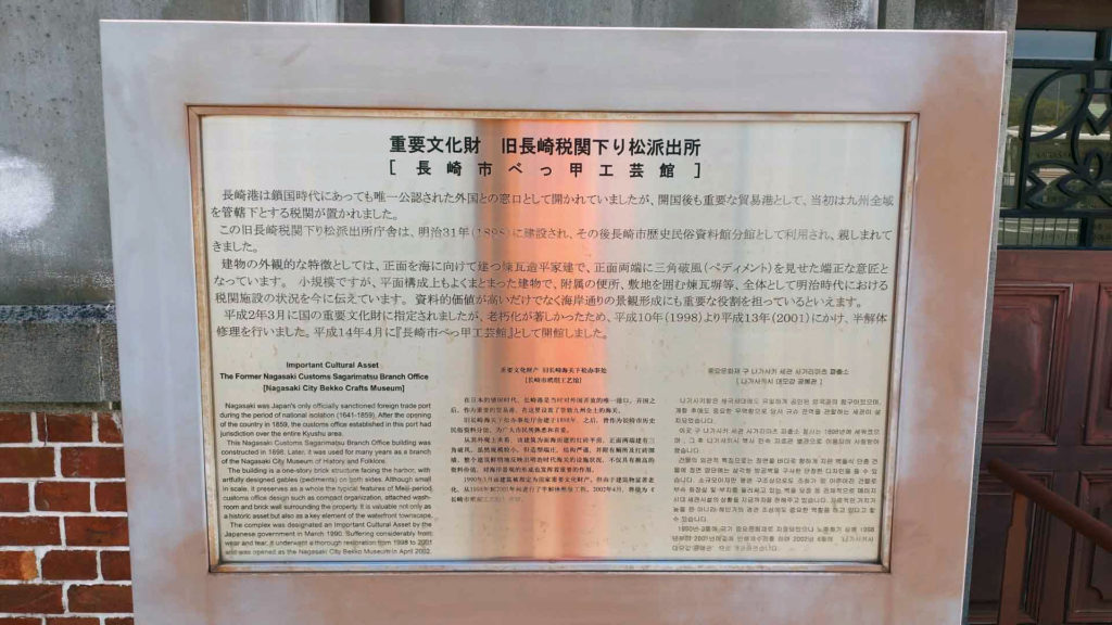 正面を海に向けて建てられています。建物は煉瓦造、平屋建で擬洋風建築という幕末から明治時代初期に日本の伝統的な建築方法と外観に洋風のデザインを取り入れたもののようです。税関の施設として使用後に長崎市歴史民俗資料館として使用され、その後半解体修理が実施され2002年からは長崎市べっ甲工芸館として使用されています。