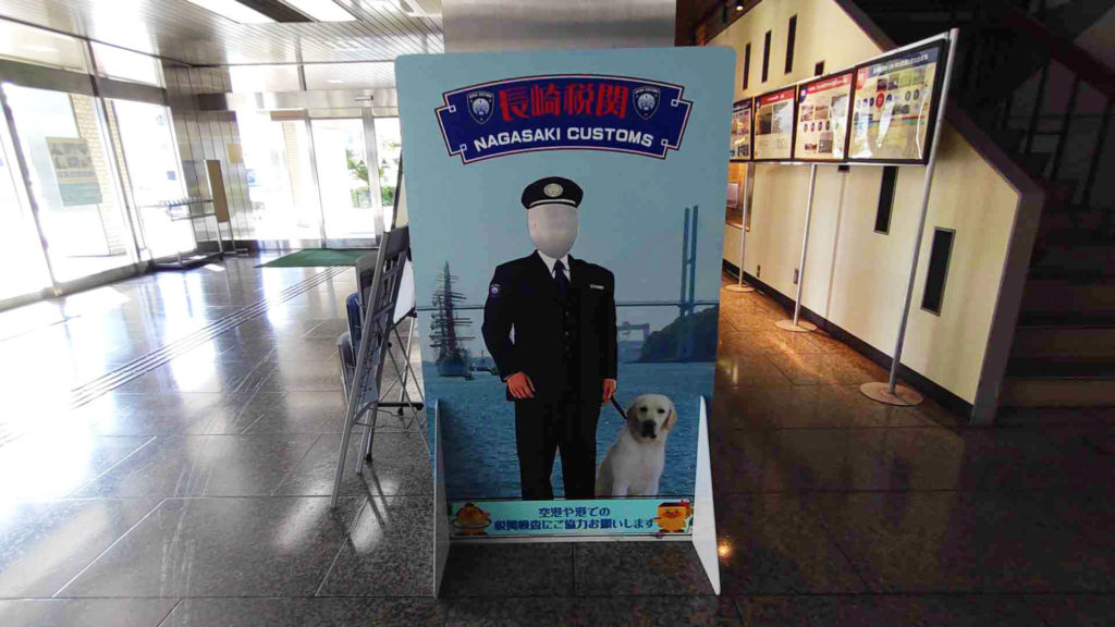 その側面には長崎税関の顔はめパネルがありました。顔をはめるだけで麻薬探知犬を連れたハンドラーさんになったような写真が撮れます。顔をはめないとプライバシーに配慮して顔の部分を修正処理したような写真が撮れました。