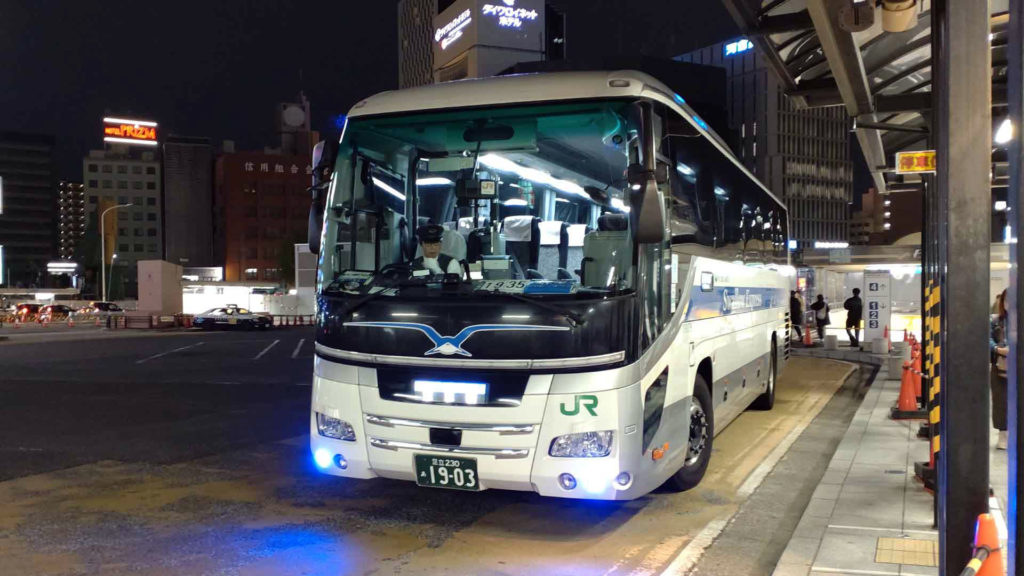 東名ハイウェイバスの新東名スーパーライナー22号に乗ります。車両は日野自動車の大型バス セレガ。この新東名スーパーライナー22号が東名ハイウェイバスで名古屋から東京まで当日中に移動できる最後の便でした。名古屋駅前を17:30に出発します。見た目は観光バスと同じですが路線バスなので時間になると予約をしていたとしても出発しますので初めて乗る場合などでバス停の位置を知らなかったりするようでしたら名古屋駅は広いので早めににバス停に移動しておいた方が良いかと思います。(バス停の前に待合室もあります)