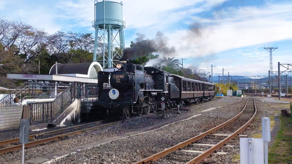 往復約1キロの線路上を蒸気機関車がけん引する客車に乗ることができるSLスチーム号というのもありました。時間が決まっていて1時間に1回くらい走行するようです。この日はC56が専用の客車を牽引していました。一番最後の時間帯の走行が終わると機関車の整備や転車台を経由して車庫に入っていくのが見れるらしいです。