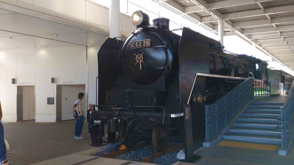 こちらの車両は蒸気機関車のC62です。東海道本線などの主要な路線で特急列車などの客車もけん引していた機関車で国鉄の蒸気機関車の中でも代表的なもののひとつだと思います。