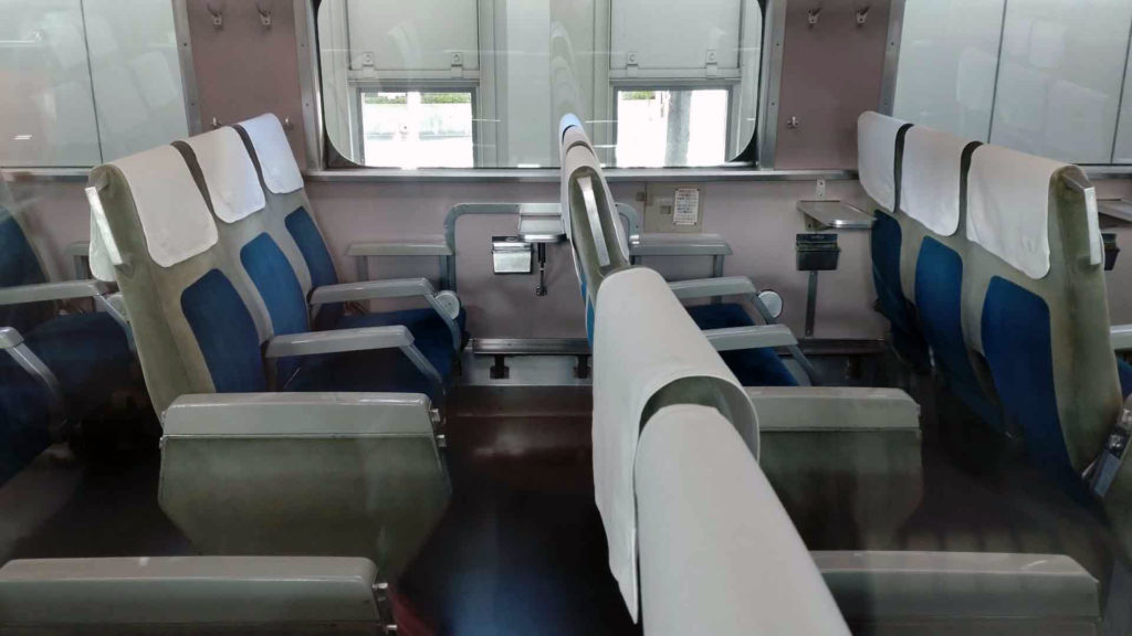 窓の外から車内も見えます。転換クロスシートなのとか今の新幹線とはだいぶ違いますね。