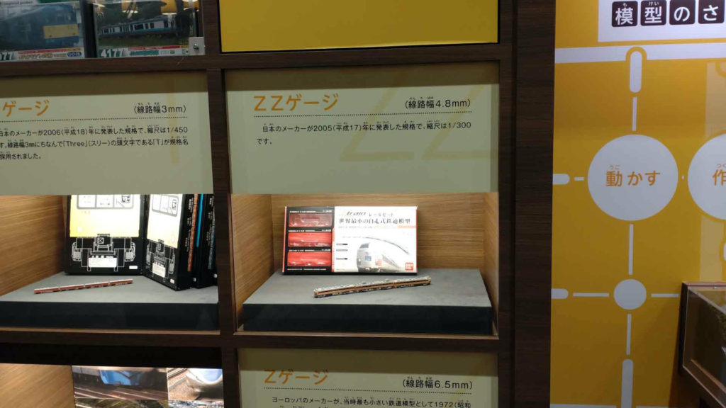 鉄道模型についての展示コーナー。Zゲージまでは知っていましたがZZゲージというさらに小さいものもあるのは知らなかったです。
