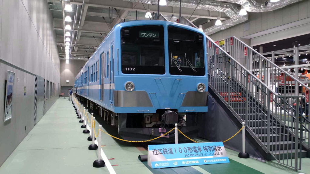 京都鉄道博物館の本館にはJRの営業線と繋がった引込線があり、現役の車両を中心に定期的に特別展示が実施されています。僕が行った時は滋賀県の私鉄である近江鉄道(おうみてつどう)の100形が展示されていました。この車両は元々は西武鉄道の新101系、301系だった車両です。