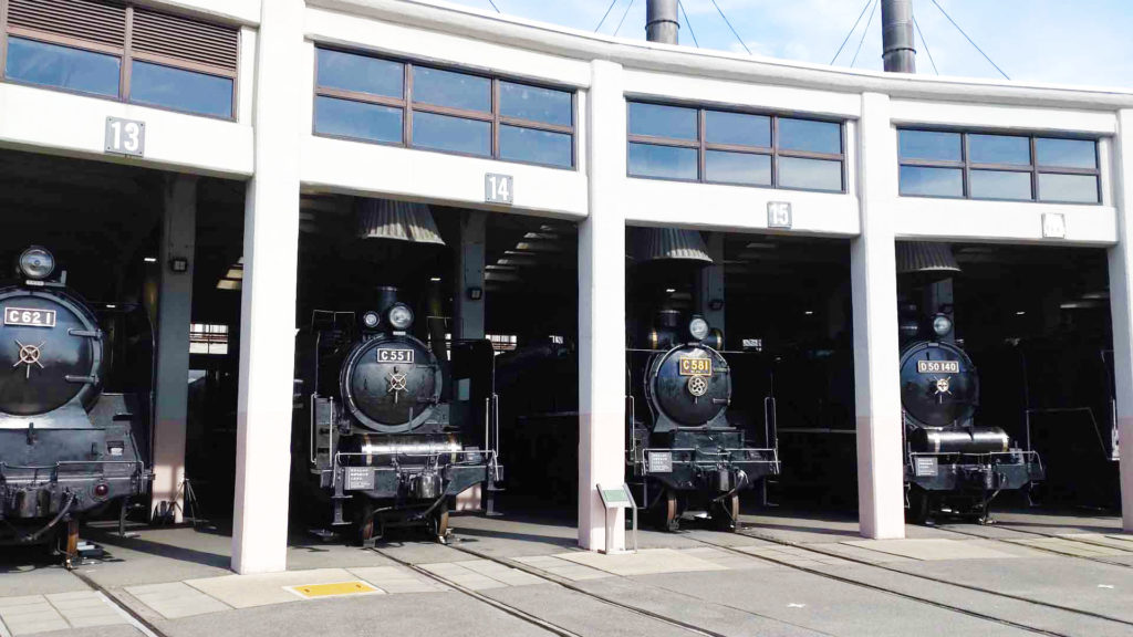 そしてこの扇形車庫は車庫の中まで歩いて入って行って見学することができます。今でもSLを走らせている場所などで転車台を近くで見学できる場所はありますが車庫の中まで普段から入れるという場所は中々無いかと思います。この写真に写っているのは左からC62、C55、C58、D50。C62はプロムナードにも展示されていましたがこちらは1号機。C55は1935年より製造された亜幹線での旅客列車用の蒸気機関車です。C58はローカル線でも走れるように造られている蒸気機関車で1938年から製造されていました。D50は1923年から製造された貨物列車用の蒸気機関車です。