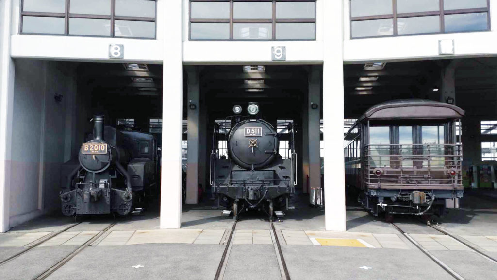扇形車庫には走行できる状態で保存されている動態保存の車両と走行はできない静態保存の車両が保存、展示されています。