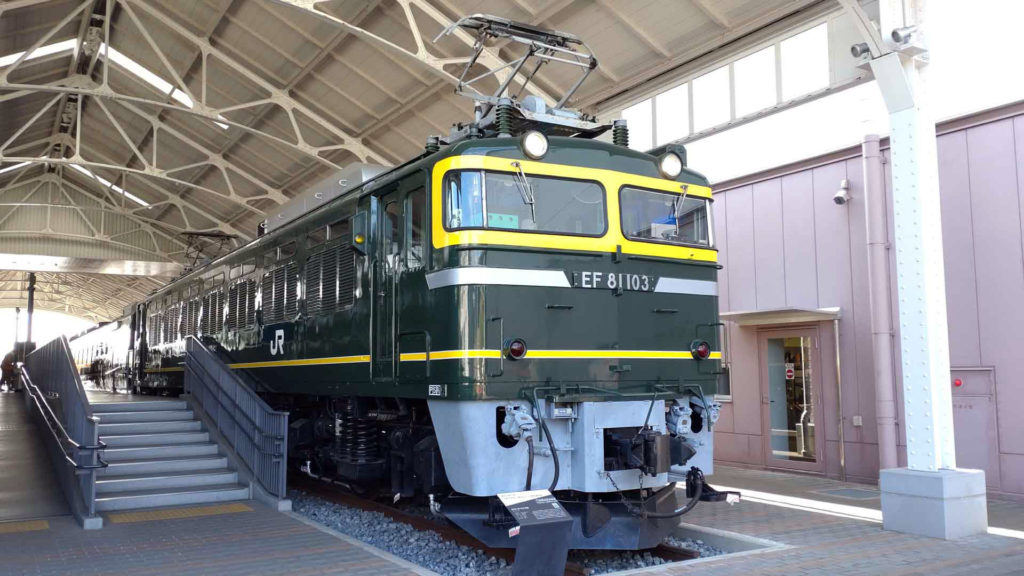 EF81は直流、交流50Hz、交流60Hzの3つの電化方式の区間を走行することができる交直流電気機関車です。EF81の標準の色はローズピンクなのですが、このEF81は大阪駅~札幌駅の間を走行していたトワイライトエクスプレス用の塗装になっています。トワイライトエクスプレスでは大阪から青森までをこのEF81が牽引していました。