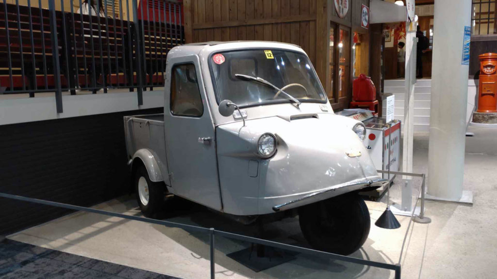 その駅舎の前にはダイハツミゼットが展示されていました。ミゼットはダイハツが1950年代から1972年代まで製造していたオート三輪(フロントがタイヤ1つでリアがタイヤ2つのトラックみたいな車両で戦前から戦後しばらくくらいの時代に多くの車種があり街中などで多く走っていたようです)です。ここに展示されていたのはミゼットのなかでも後期に作られたタイプです(前期はバイクのようなバーハンドルでヘッドライトが中央に1つで後期は自動車のような丸ハンドルでヘッドライトも2つのタイプです。それぞれ見た目も結構違います)僕は小学生の頃このミゼットが大好きでミゼットが出ている映画という事で桑田佳祐さんが監督だった稲村ジェーンを観てそれからサザンを好きになりました。