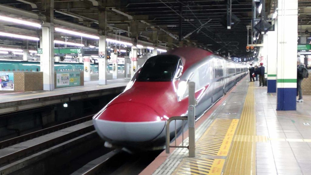 乗車する新幹線が入線してきます。この赤い新幹線車両は秋田新幹線こまち用のE6系。ですが今回は秋田方面行ではないです。