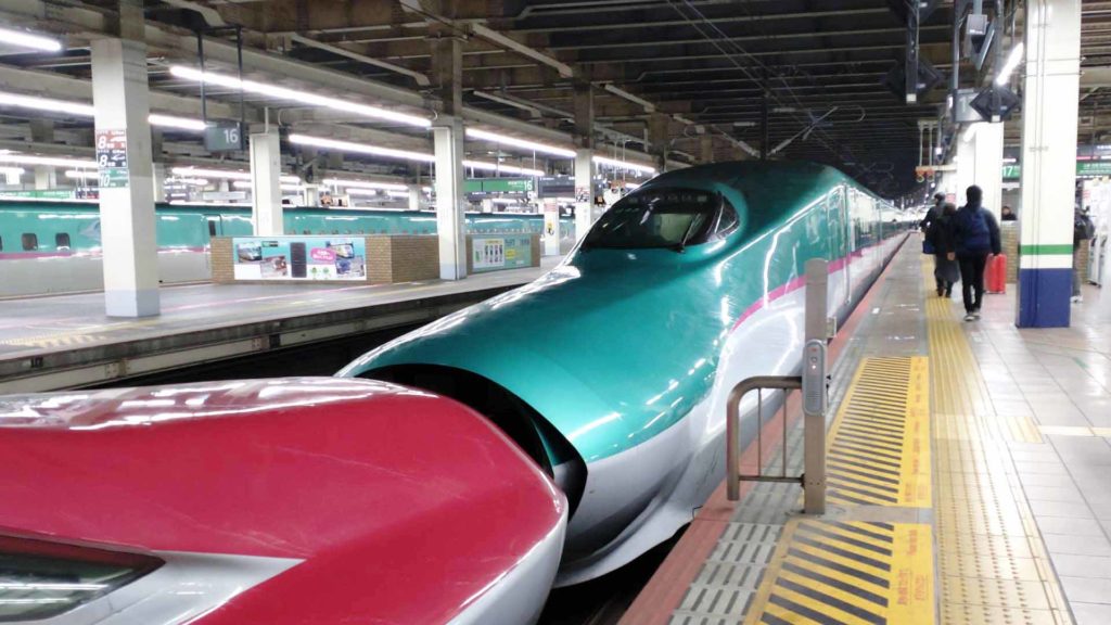 東北新幹線はやぶさに乗ります。車両はE5系。今回乗ったはやぶさは盛岡駅までこまちと連結しての走行です。E5系とE6系は車両のサイズも違う(E6系は盛岡から秋田までは在来線の区間(線路は新幹線と同じ幅にしてあるけど駅やトンネルなどは在来線のまま)を走るので車両が小さい)のに連結して最高時速320キロなんていうめちゃ速い速度で走行することができるのは凄いなと毎度思います。
