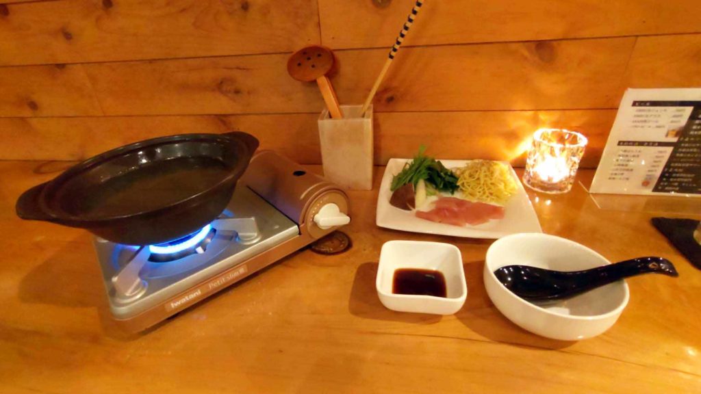 夕食は青森のブランド地鶏 青森シャモロック などの食材を使った焼き鳥がメインのコース料理でした。こちらの写真はシャモロックささみのしゃぶしゃぶです。しゃぶしゃぶを楽しんだ後は麺を入れて〆のラーメンが食べれました。夕食会場は薪ストーブがあってとても雰囲気が良かったです。