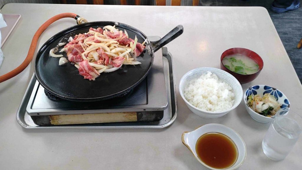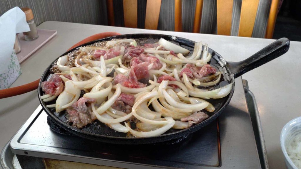 バラ焼き定食 を頂きました。バラ焼きとご飯、みそ汁、キムチが設置になっています。それぞれのテーブルの上にあるガスのホースが繋がっているコンロが設置されていてバラ焼きを注文後、店員さんが鉄板をセットして火をつけタレをかけたバラ肉とタマネギを鉄板に載せてくださいます。
