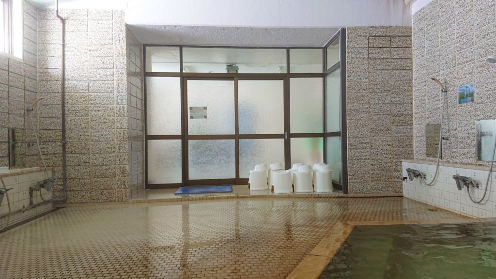 浴槽と脱衣所の間は曇りガラスなので脱衣所が空いているタイミングで温泉を出たりなどがしやすいです。扉の近くには洗い場で使用する桶と椅子が並べてありました。