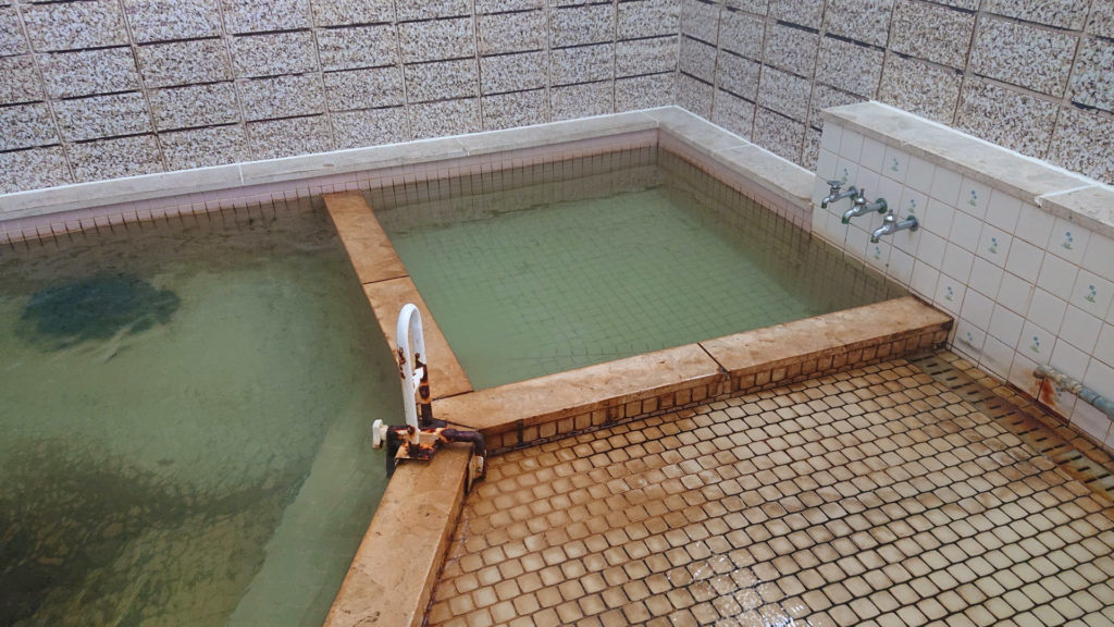 左側の浴槽の壁際の石でできた湯口から沢山の源泉が投入されています。