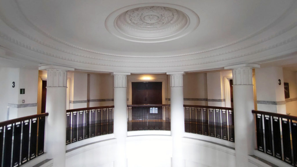 3階に上ったところですぐ近くに見えるエントランスホールの1階から吹き抜けになっている天井付近です。
