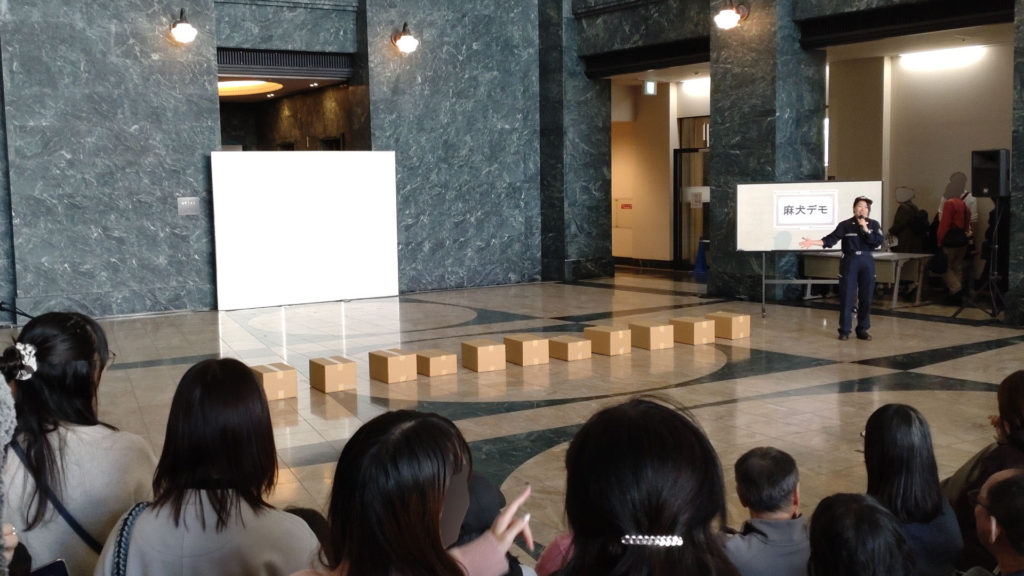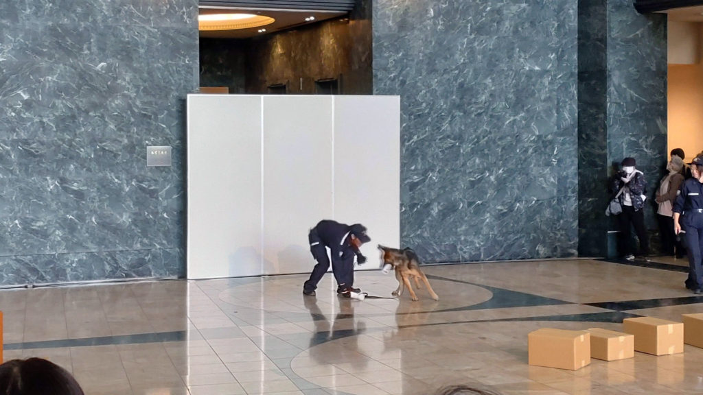プログラムに記載はなかったのですが午後は中庭にカスタム君が放し飼いになっていました。前年のオープンカスタムス2024では神戸税関のカスタム君とカスタムちゃんが1頭ずつ交代で中庭を徘徊していたのですが今年はカスタム君が2頭ずつシフトを組んで中庭へ。