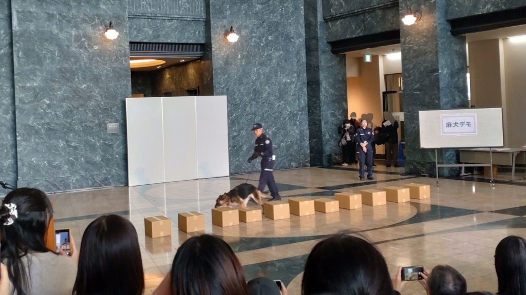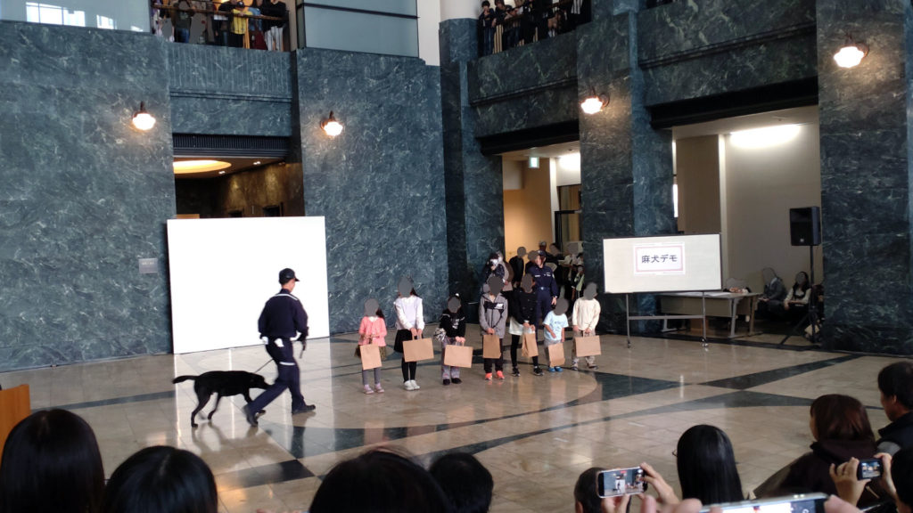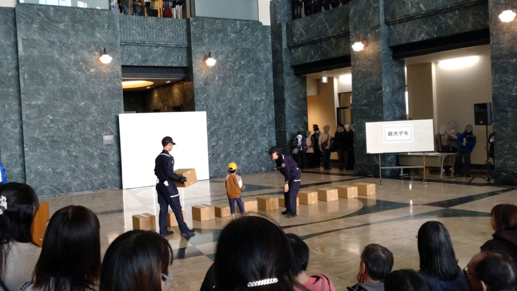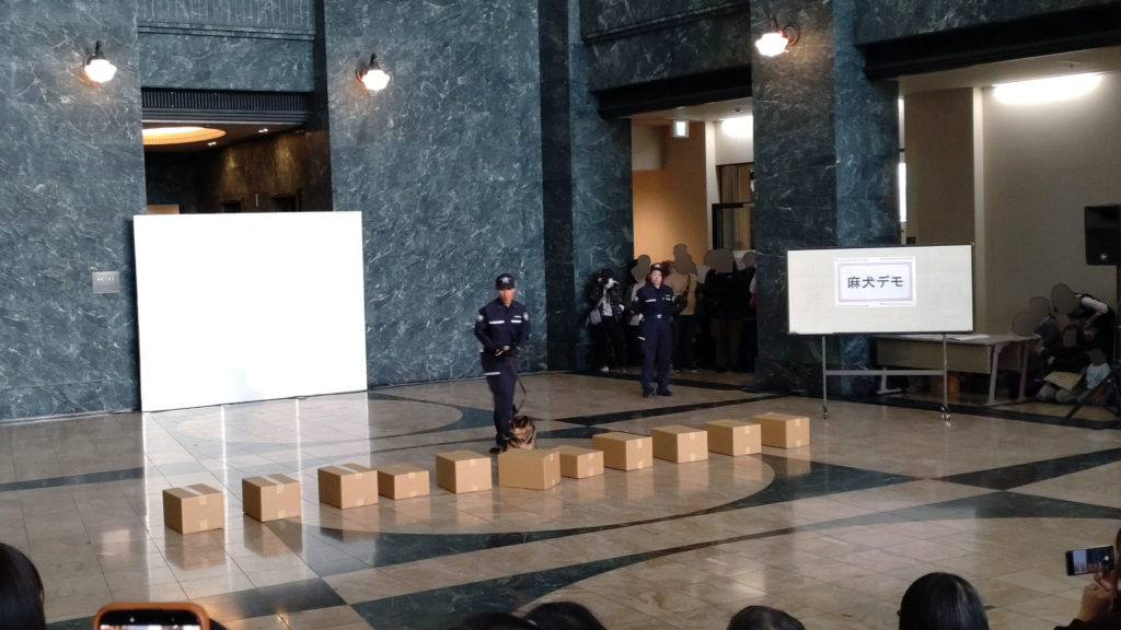 メインステージでは本日2回目の麻薬探知犬デモンストレーションのお時間です。並べた荷物(ダンボール)の中に不正薬物が無いか麻薬探知犬が探してくれます。