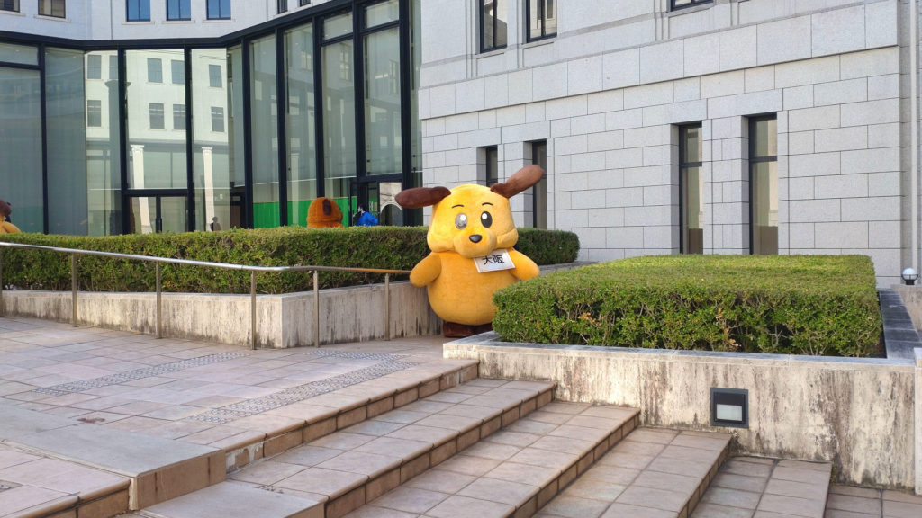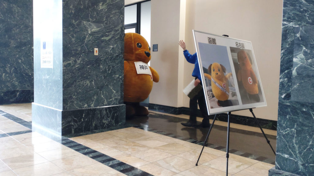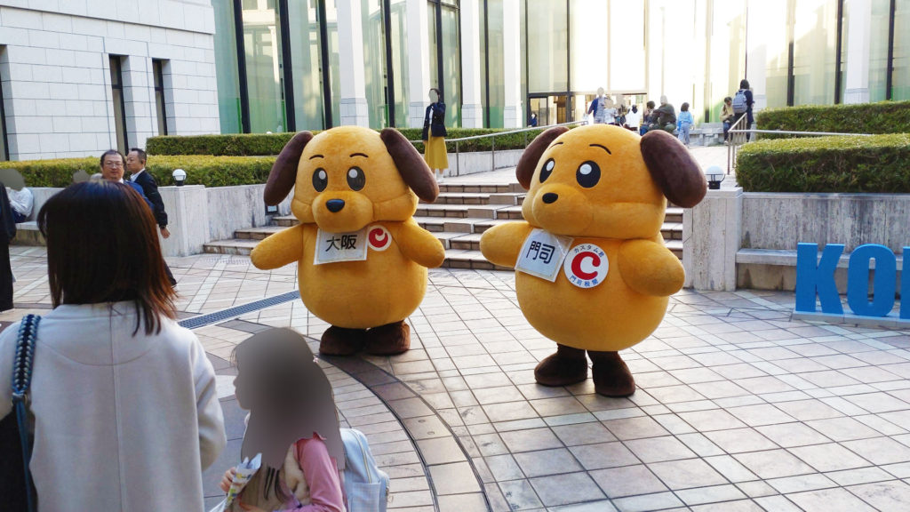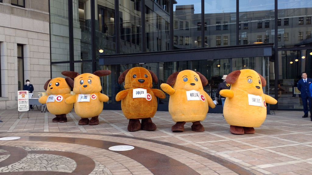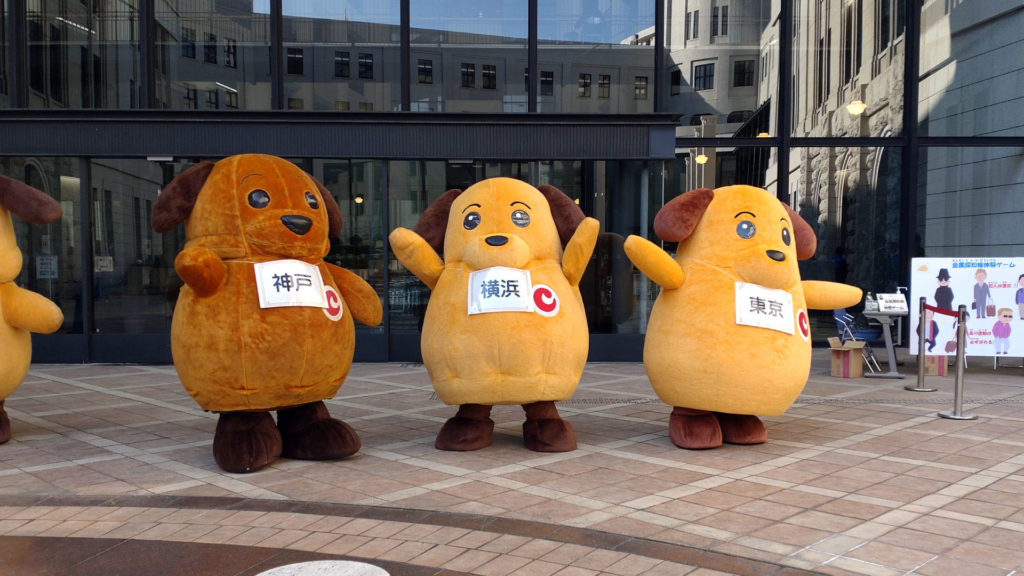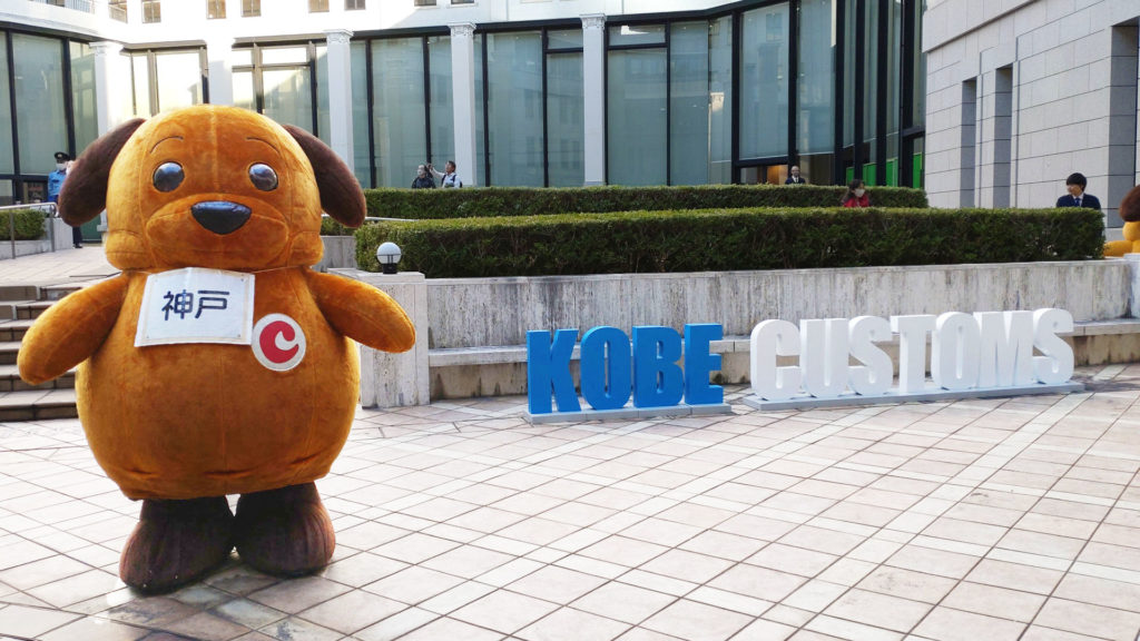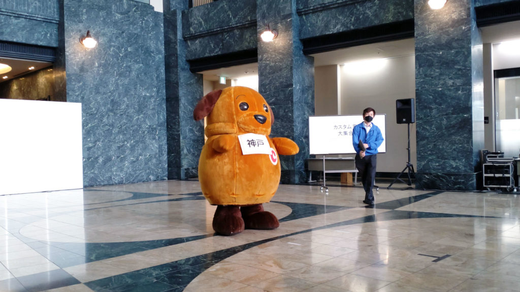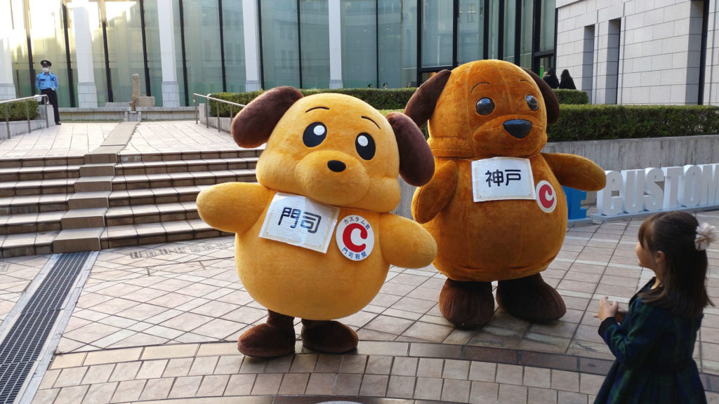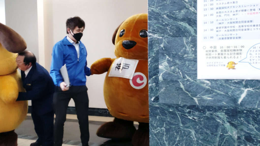 カスタム君(東京税関)とカスタム君(横浜税関)は隣の管轄を担当していますが2頭が並んでいるには初めて見ました。しかも神戸で。そもそも同じキャラクターが並んでいる時点で謎ですが。この2体は見た目が似ているのでぱっと見、左右に高速移動して分身してるように見えますね。