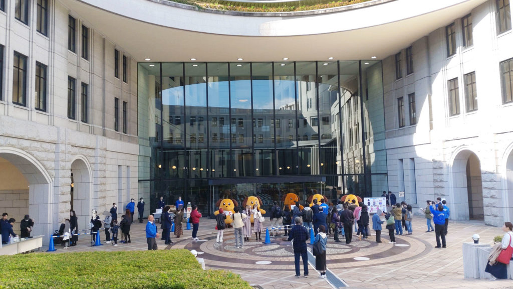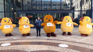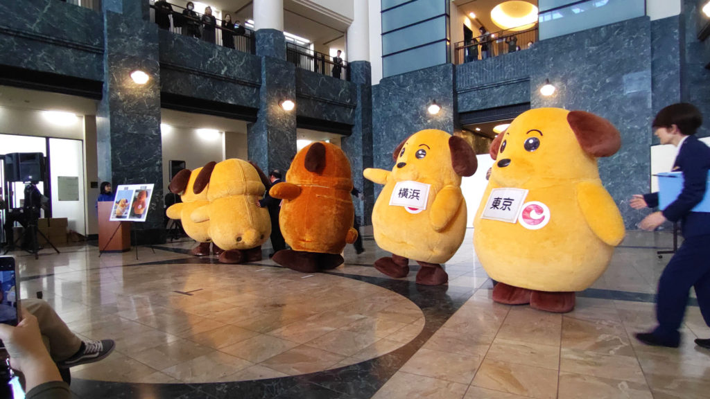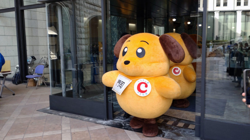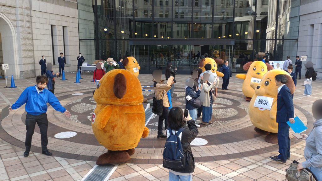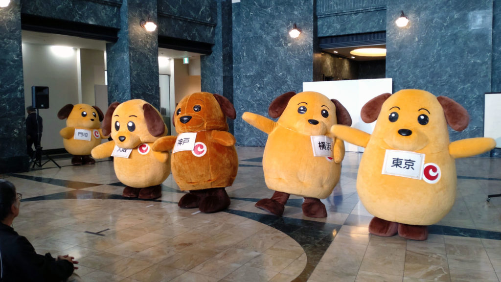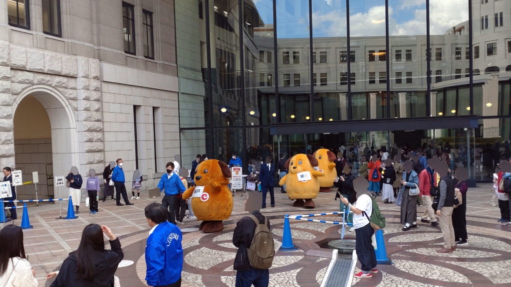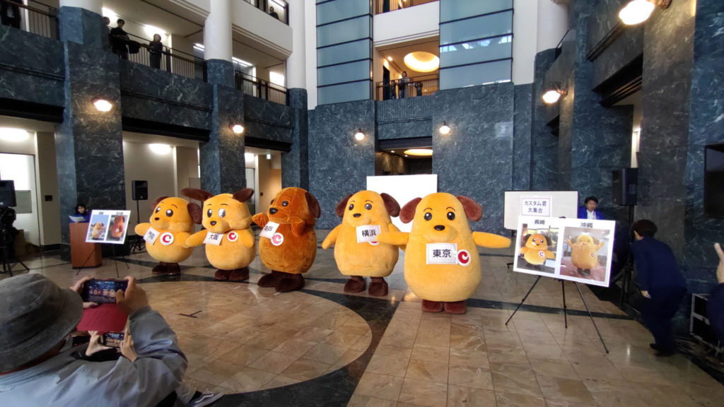これは現実(リアル)です。右からカスタム君(東京税関)、カスタム君(横浜税関)、カスタム君(神戸税関)、カスタム君(大阪税関)、カスタム君(門司税関)。6月の横浜税関庁舎公開で4頭のカスタム君が集合したところ大盛況だったことに味を占めたようで今回は同じキャラクターを5頭揃えてきました。ディズ〇ーでいえばミッ〇ーマウスを5体並べるようなもんです。今回はカスタム君ファンのビギナーにも分かりやすいように首からそれぞれの税関の札をぶらさげていました。税関優しい。