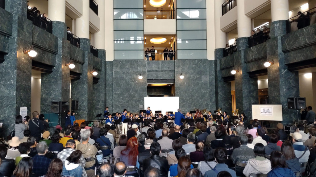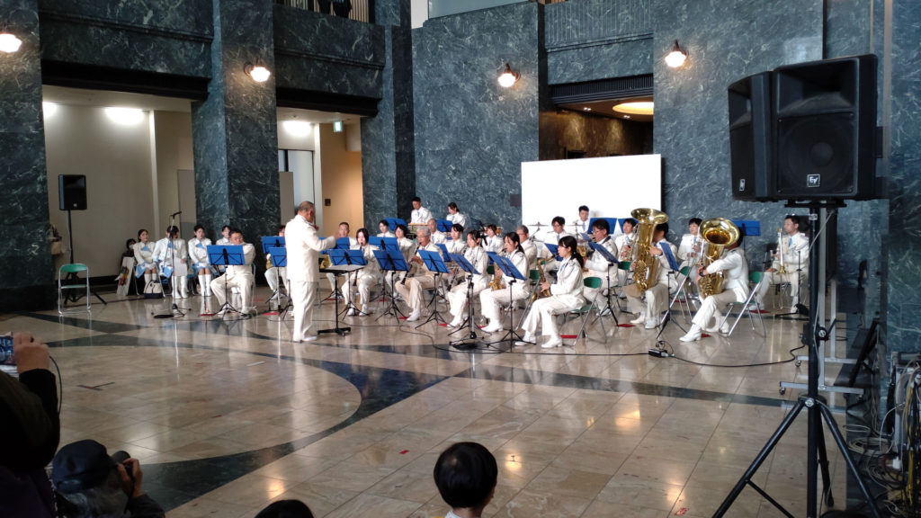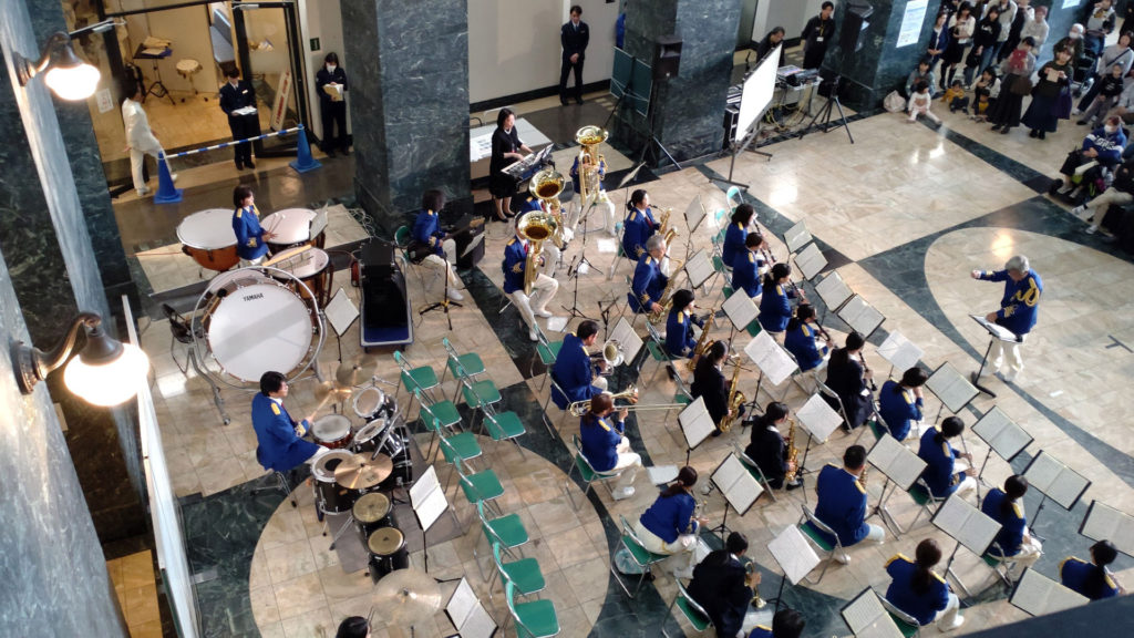 新館アトリウムでは神戸・大阪税関合同音楽隊の演奏が行われていました。このプログラムでは愛徳学園中学校・高等学校吹奏楽部とのコラボ演奏も。