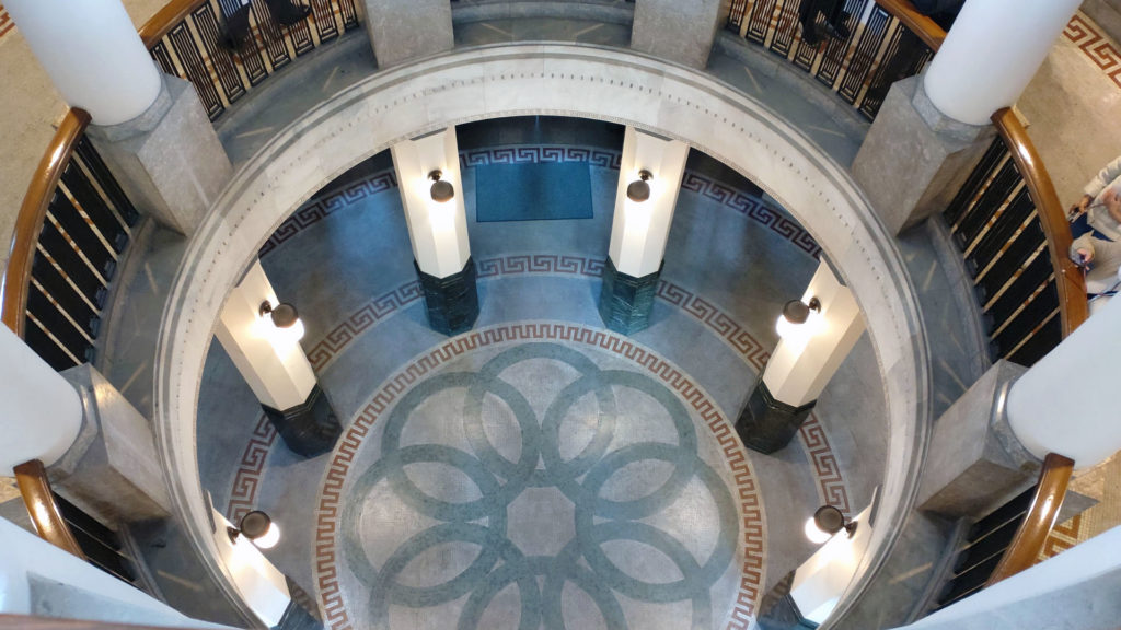こちらは東門から入ったところにあるエントランスホール。1階は広報展示室に行くときに通るルートですが2階より上の階はオープンカスタムスなどの庁舎公開でのみ行く事ができます。