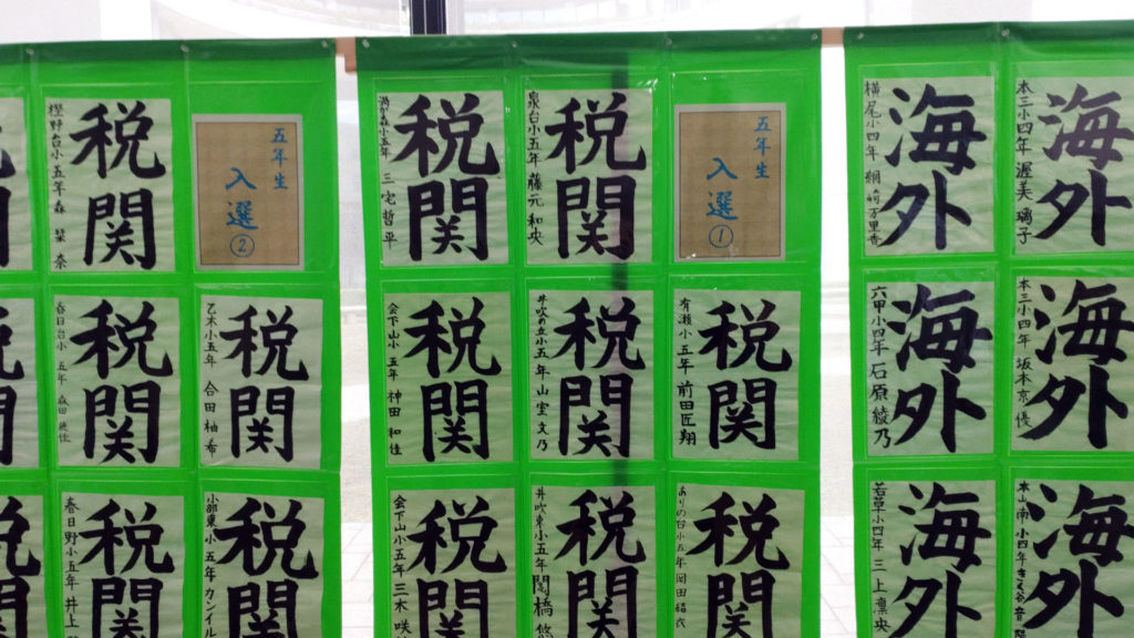 広報展示室の近くには第30回神戸税関児童書道コンクールの入選作品も展示されていました。税関そして海外。この展示はオープンカスタムスの1週間前から展示されていたそうです。